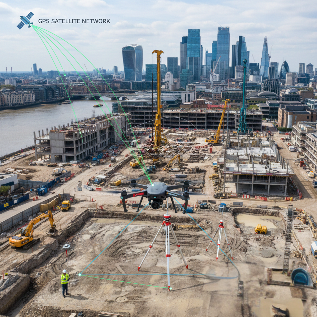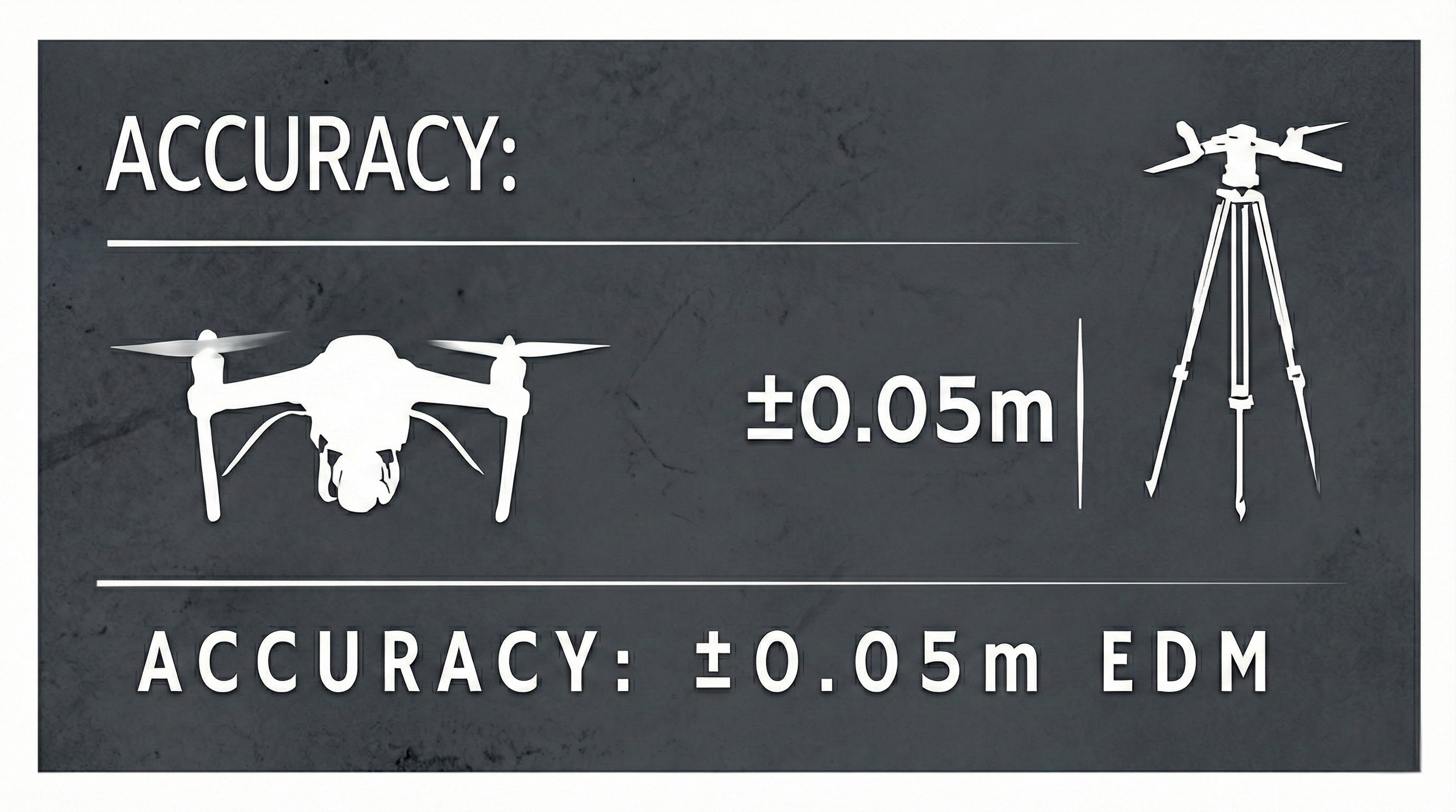 By measuring the internal angles of triangles formed between the drone and EDM stations, we triangulate positions with horizontal and vertical accuracies of 1–3 cm and 2–5 cm, respectively.